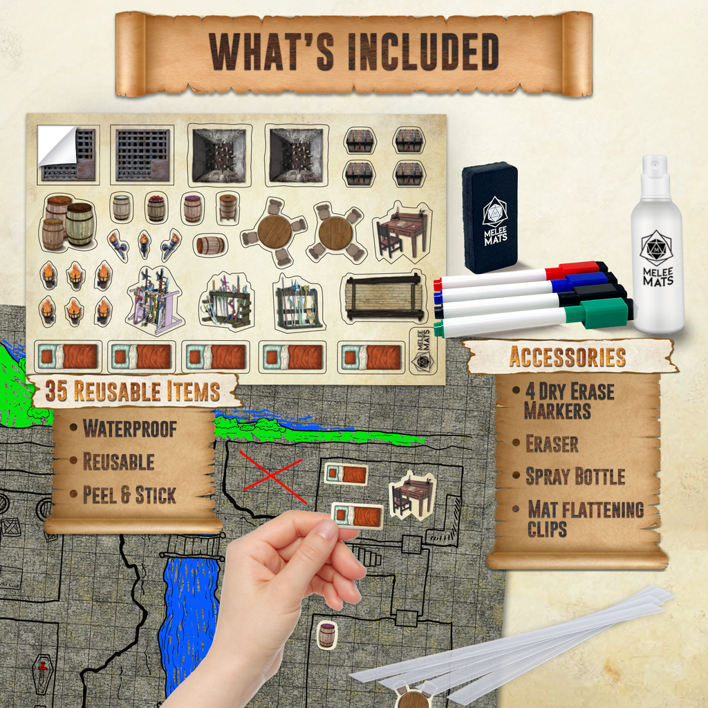 - YOUR SLOPPIER FRIENDS CAN’T DAMAGE IT – ULTRA DURABLE, DOUBLE COATED DND MAP: Because serious gamers play for hours on end, snacking is a must, so while most DND board setups look worn, torn, and stained after just a few rounds, we engineered MELEE MATS DND dry erase map from the highest grade materials, then added an EXTRA FINISHING COAT, making it the BEST DND game mat for erasing, reusing, and yes, even wiping away messy Cheetos fingerprints.
